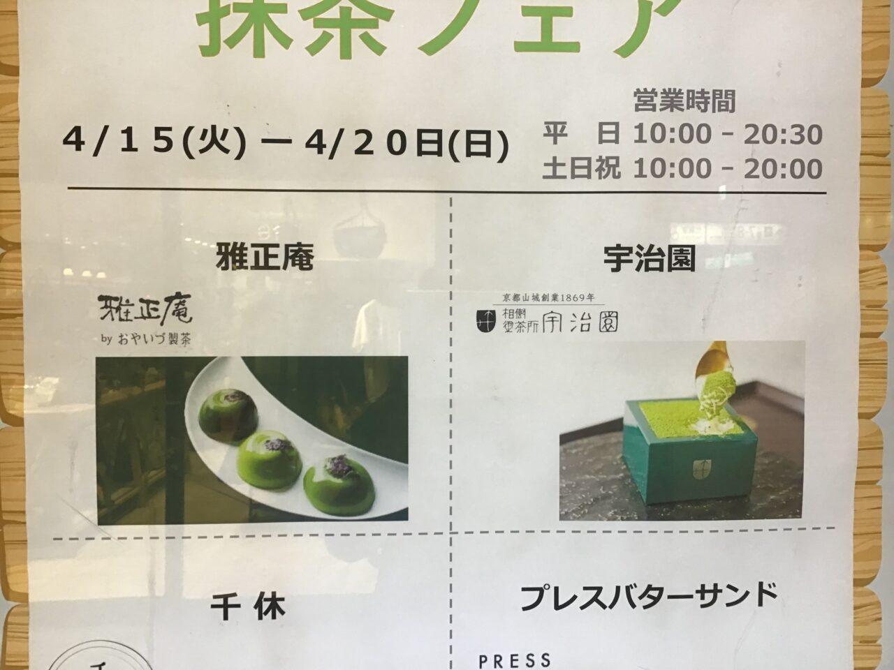出店するのは雅正庵、宇治園、千休、プレスバターサンドの4店舗です。