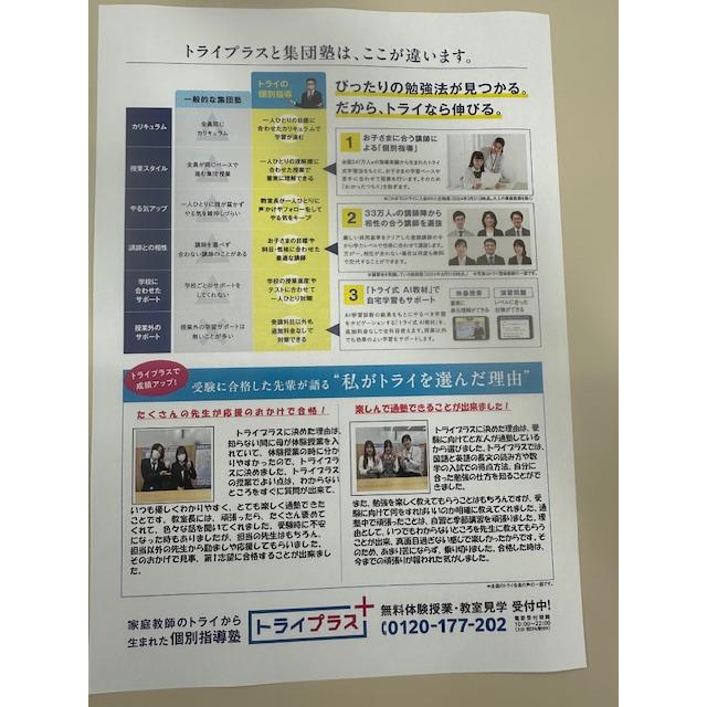 トライプラスの体験談付きの広告です。二名ともよく頑張ってくれた生徒です。このような生徒の居場所を作り上げていきたいです。