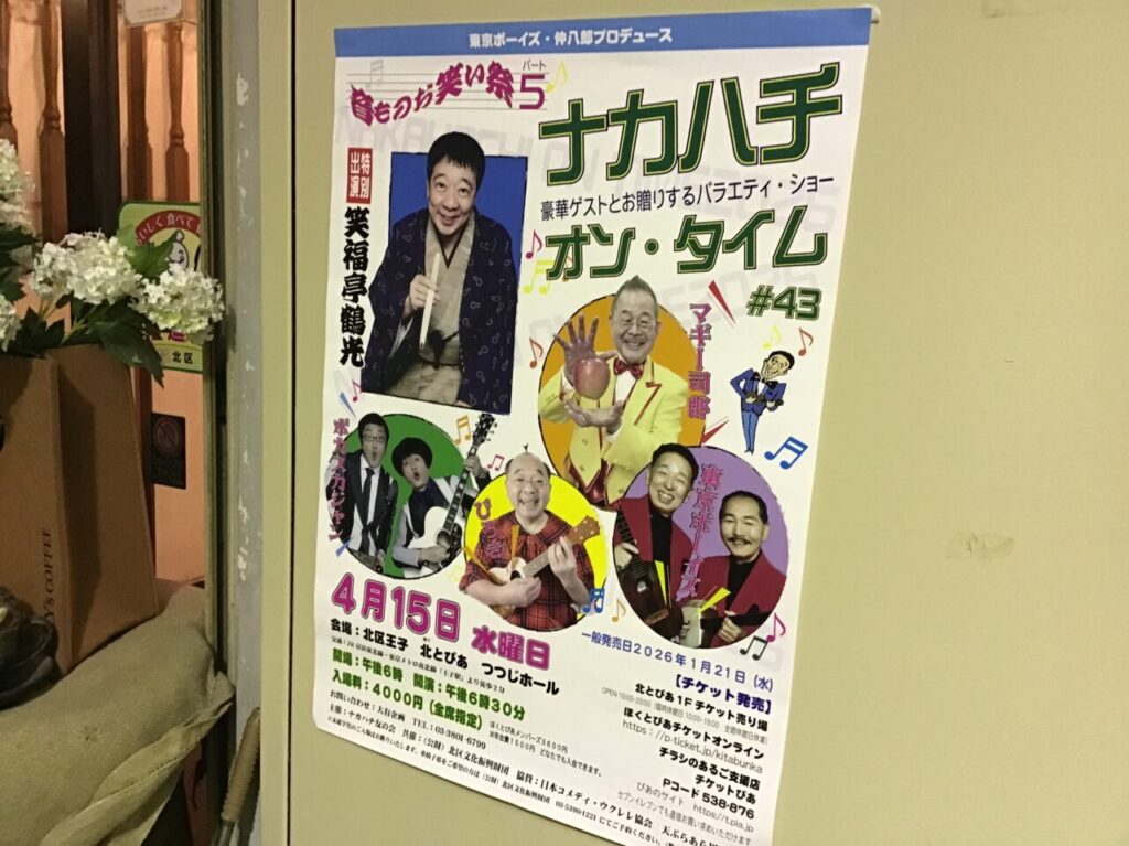【東京都北区】マギー司郎、ポカスカジャン、ぴろきも出演! 「ナカハチ・オン・タイム#43」のポスターを街なかで見かけました。